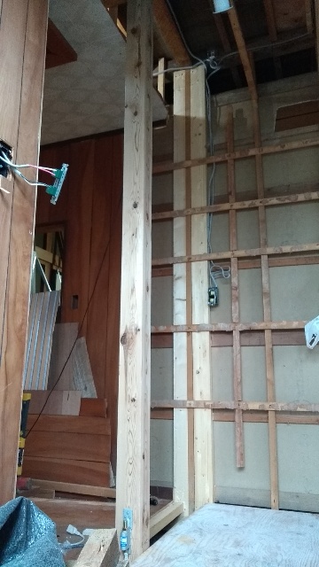 次に既存の柱に壁材を貼りやすくするための3寸5分幅の材を抱かせました。既存柱は3寸ですが、新設土台、新設柱は三寸5分を使っています。